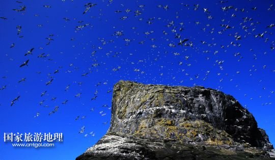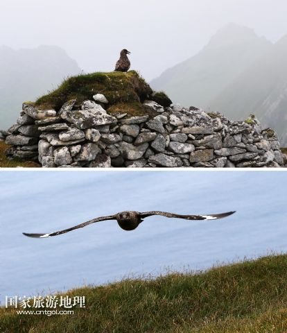 登上圣基爾達島并非易事,記者因風高浪大在外赫布里底群島等待多日才有船出海。僅可乘載10余人的小船在風浪中穿行了近3個小時,圣基爾達島終于出現(xiàn)在霧色籠罩的海面上。島上散落著十余座已經(jīng)荒蕪破敗的石舍和幾百個儲物石室,這些殘存的遺跡早已成為野羊與海鳥的巢穴,人類反而成為外來的訪客。人類文明的消失為一些稀有的物種和瀕臨滅絕的鳥類提供了安全的棲息地。島上陡峭的山坡隨處可見野羊悠然漫步,而那些嶙峋的峭壁和海礁則棲息著數(shù)十萬只各類海鳥。世界上最大的塘鵝群——約6萬對塘鵝在這座海島及附近的海礁上繁衍生息。