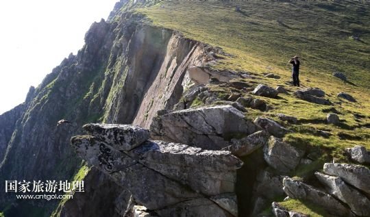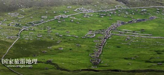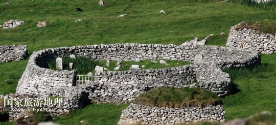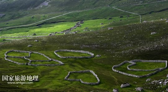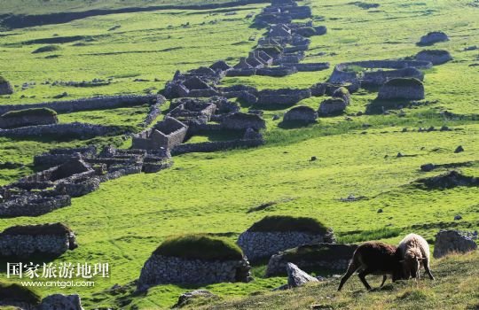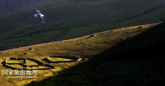 國家旅游地理 英國倫敦8月14日訊 在圣基爾達島已經(jīng)遺棄的村落旁的山坡上,有用石頭圍墻圈起的一塊塊耕地。當年在島上定居的村民在這些石圈內(nèi)鋪墊海藻,種植少量谷物。一個個形狀各異的石圈保護著這些寶貴的谷物免遭風暴與家畜的侵害(7月19日攝)。
