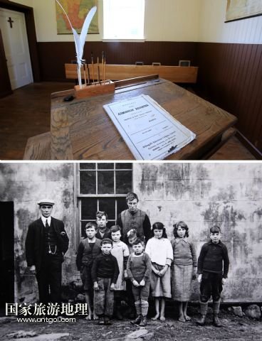 上圖,圣基爾達島上只有一個教室,一排課桌的小學校內(nèi)景(7月19日攝)。學校后來經(jīng)過重新整修。下圖,當年島上學校師生的合影(資料照片,蘇格蘭國家信托基金會提供)。