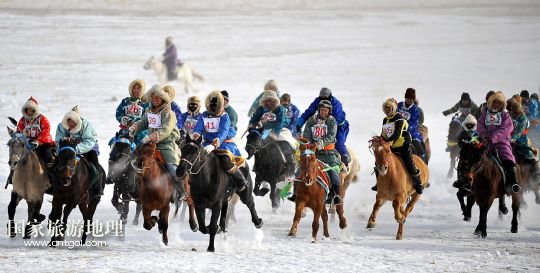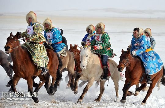 國家旅游地理 內(nèi)蒙古錫林郭勒1月5日訊 1月4日,牧民們在賽馬比賽中。當日,2014年“銀色西烏珠穆沁”杰仁馬文化節(jié)在內(nèi)蒙古錫林郭勒盟西烏珠穆沁旗舉行。當?shù)孛晒抛迥撩裆碇A麗的服飾,帶著自家的馬匹,冒著風雪嚴寒,從四面八方趕到會場,參加了賽馬、套馬、乘馬拾物、蒙古馬選美等多項比賽,吸引了來自全國各地的游客、攝影愛好者以及附近的大批牧民。 /新華社記者任軍川攝