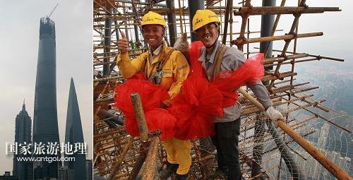 拼版照片:(右圖)安裝最后一榀桁架的工人張永新(左)和龔建飛在塔冠結(jié)構(gòu)工程完工后留影(8月3日攝)。新華社記者 裴鑫 攝;(左圖)從外灘遠(yuǎn)眺“上海中心”(8月3日攝)。