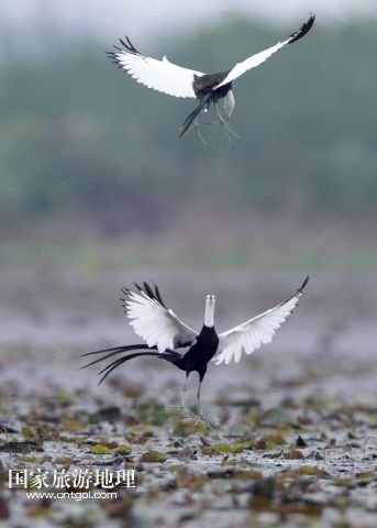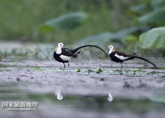 國家旅游地理 江西九江5月31日訊 5月29日,兩只水雉在江西省九江市賽城湖濕地嬉戲。入夏以來,數(shù)十只漂亮的水雉飛抵江西九江市賽城湖濕地,湖區(qū)良好的生態(tài)為水雉提供了舒適的棲息環(huán)境。水雉體態(tài)優(yōu)美,羽色艷麗,輕步行走于睡蓮、荷葉等浮葉植物上,有“凌波仙子”的美名。/新華社發(fā)(沈俊峰 攝)