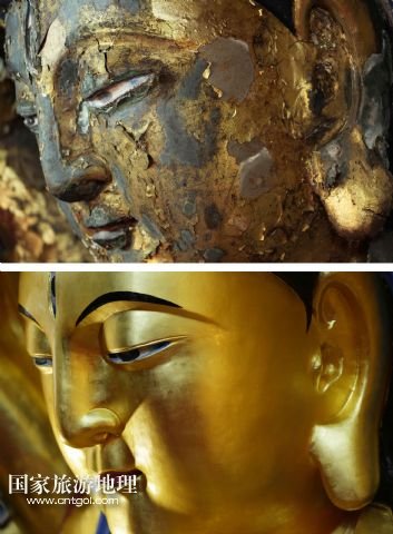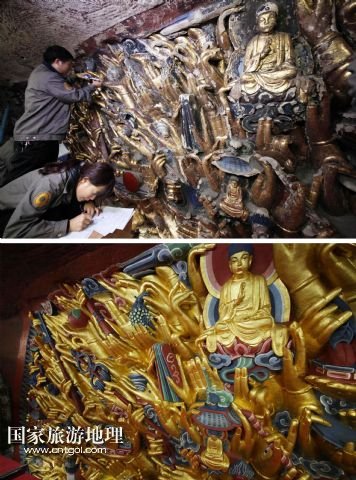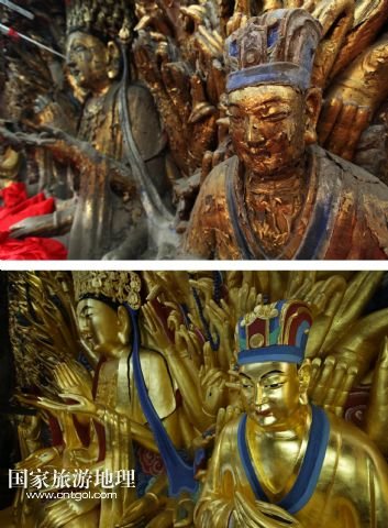 國家旅游地理 重慶6月13日訊 修復前后的重慶大足千手觀音造像局部(拼版照片,上圖上:2011年2月24日攝,上圖下:2015年3月31日攝)。