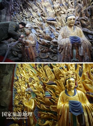 修復前后的重慶大足千手觀音造像全景(拼版照片,上圖上:2011年10月27日攝,上圖下:2015年4月4日攝)。