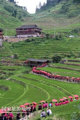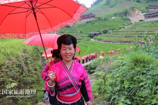 每年農(nóng)歷五月十四日、十五日是廣西桂林龍勝各族自治縣泗水鄉(xiāng)潘內(nèi)瑤寨紅瑤同胞與親朋好友聚會(huì)的日子,亦稱當(dāng)?shù)噩幷?ldquo;紅衣節(jié)”。紅瑤同胞相約在這期間開展唱瑤歌、評(píng)寨花、傳統(tǒng)刺繡、打旗公等傳統(tǒng)特色活動(dòng)。紅瑤是瑤族的一個(gè)支系,因喜穿紅色衣服而得名。 /新華社發(fā)(石農(nóng)兵 攝)