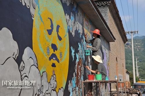 8月10日,兩名藝術(shù)家在山西省和順縣許村的墻壁上繪畫創(chuàng)作。近年來,許村發(fā)展旅游業(yè),三次舉辦鄉(xiāng)村藝術(shù)節(jié)并邀請國內(nèi)外藝術(shù)家參加創(chuàng)作,讓現(xiàn)代藝術(shù)和鄉(xiāng)村文明相互融合。