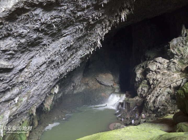 這是羅甸縣的大小井風(fēng)景區(qū)的響水洞天坑,典型的喀斯特地貌景觀。這個(gè)天坑位于大井出水口西側(cè)大約200米處,坑口高500米,寬500,深200米。內(nèi)有暗河,水聲轟鳴,在坑外十里處都可以清晰聽到,故稱為響水洞天坑坑口寬敞明亮,暗河奔流,水花飛揚(yáng),氣勢磅礴,蔚然壯觀??觾?nèi)巨大的鐘乳石如寶劍懸掛在墻壁上,有的錯(cuò)落城橋,有的如猛虎下山,千姿百態(tài),美不勝收。